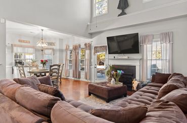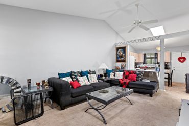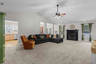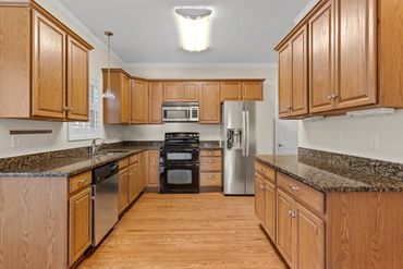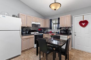 The spacious living room boasts vaulted ceilings, a gas fireplace, and plenty of natural light. It flows seamlessly into the dining area and the stunning kitchen, complete with white cabinets, granite countertops, stainless steel appliances, a pantry, and a breakfast bar that’s perfect for entertaining.