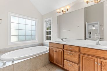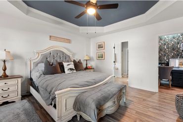 The oversized main-level master suite is your private escape, featuring a tray ceiling, newer laminate floors, and a ceiling fan. The ensuite includes a soaking tub, walk-in shower, and a spacious walk-in closet—your perfect oasis.